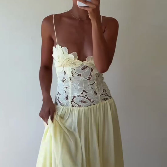The Stephanie Maxi Dress is a maxi length dress with a sheer lace waist detailing and lined bust cups that falls into a gathered, full skirt. The dress has roleau straps with length extension for the perfect fit. The Stephanie is the perfect piece for your next special event.